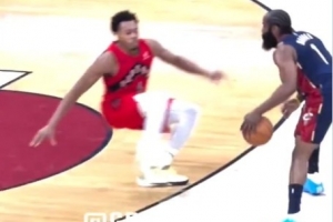 GIF-斯科蒂·巴恩斯喋喋不休喷哈登 后者言语不做回复 回头直接将巴恩斯晃翻在地&还命中三分