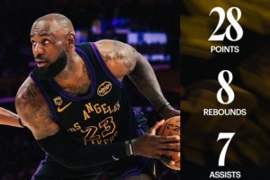 赛后湖人官方发布詹姆斯数据海报,本场比赛詹姆斯出战39分钟20投8中,三分5中2,罚球14中10砍下28分8篮板7助攻,正负值+6。