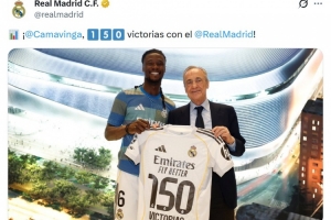 卡马文加在赛后获赠印有150胜字样的皇马纪念球衣,皇马官方也晒出了卡马文加和皇马主席弗洛伦蒂诺合影留念的合照,并配文“卡马文加达成皇马150胜”。
